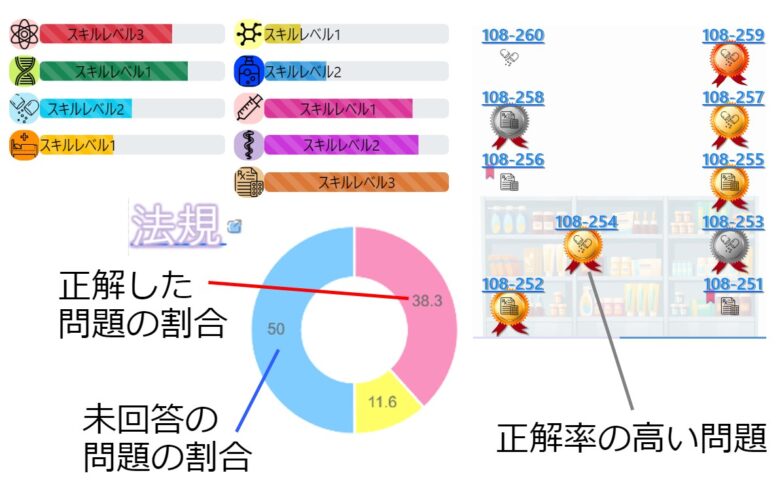 範囲が広大な国家試験。合格には未着手問題だけでなく、復習との両立が必須です。まるちーずは問題を一問ずつ全て管理。科目ごとに学習達成の割合が表示されます。更に各問題ごとのあなたの正解率も教えてくれます。