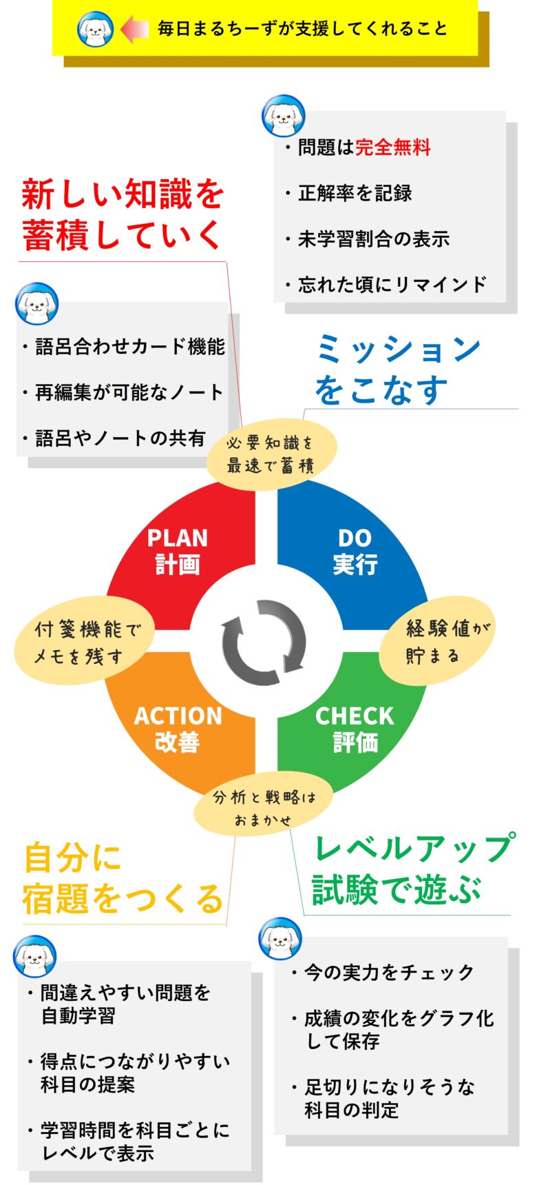 あなたの限られた時間を、まるちーずはPDCAサイクルに当てはめ管理。得意科目・リスク科目・伸び率の高い科目を解析。あなたに知らせます。